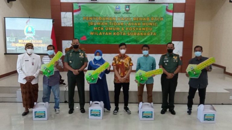 ‘ Ke 52 unit bangunan tersebut diantaranya 47 RTLH ( rumah tidak layak huni ), 4 MCK di wilayah Sangkrah, Joyosuran dan Baluwarti. 1 Posyandu di Kalurahan Manahan, Solo ‘ Jelas Dandim 0735/ Surakarta Letkol Inf Devy Kristiono, S.E, M. Si saat menyerahkan bangunan hasil rehab di Aula Dharmawangsa Makodim 0735/ Surakarta.
