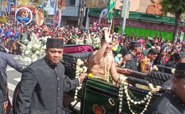 Tampak dalam iring iringan kirab, Kaesang Pangarep dan Erina Gudono yang berwibawa dan anggun dalam balutan pakaian adat jawa.