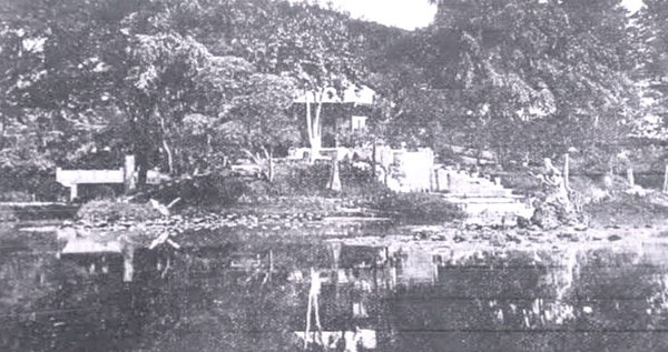 Terdapat sebuah pulau di tengah telaga nan indah yang airnya jernih. Bunga tunjung berbunga menawan yang terapung-apung membuat telaga menjadi makin tampak indah. Di tengah pulau menjulang huma yang teduh karena dirindangi pohon-pohon besar. Jalan menuju ke sana dibuat melengkung dengan cantiknya. Selain itu, pulau dilengkapi dengan goa di atas kolam dan arca yang tampak mengapung di air.