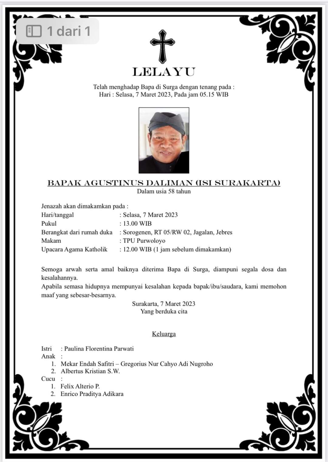 Alm Mpu Daliman wafat di usia 58th, meninggalkan seorang istri bernama Paulina Florentina Parwati, dua orang putra dan dua orang cucu. /Jk